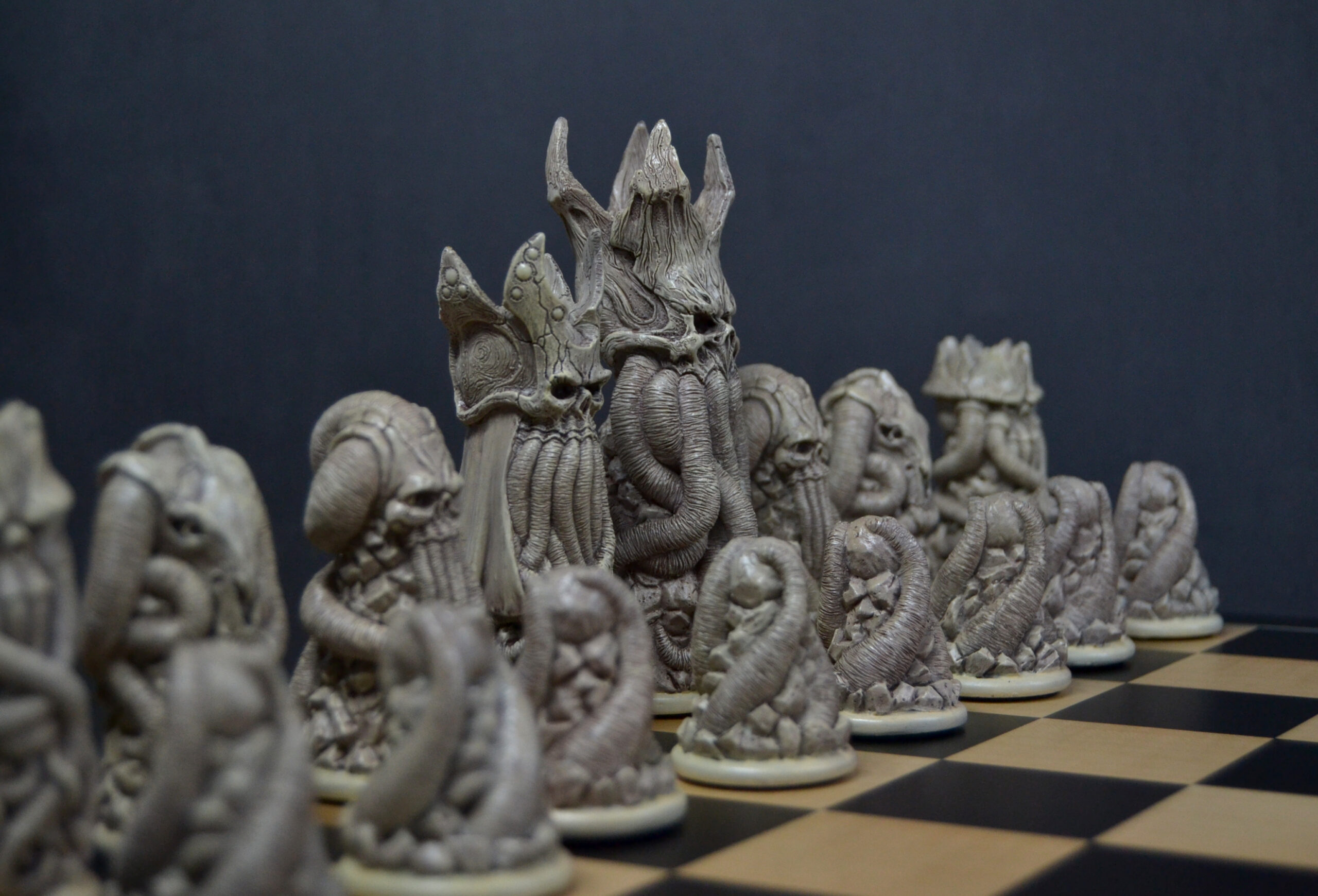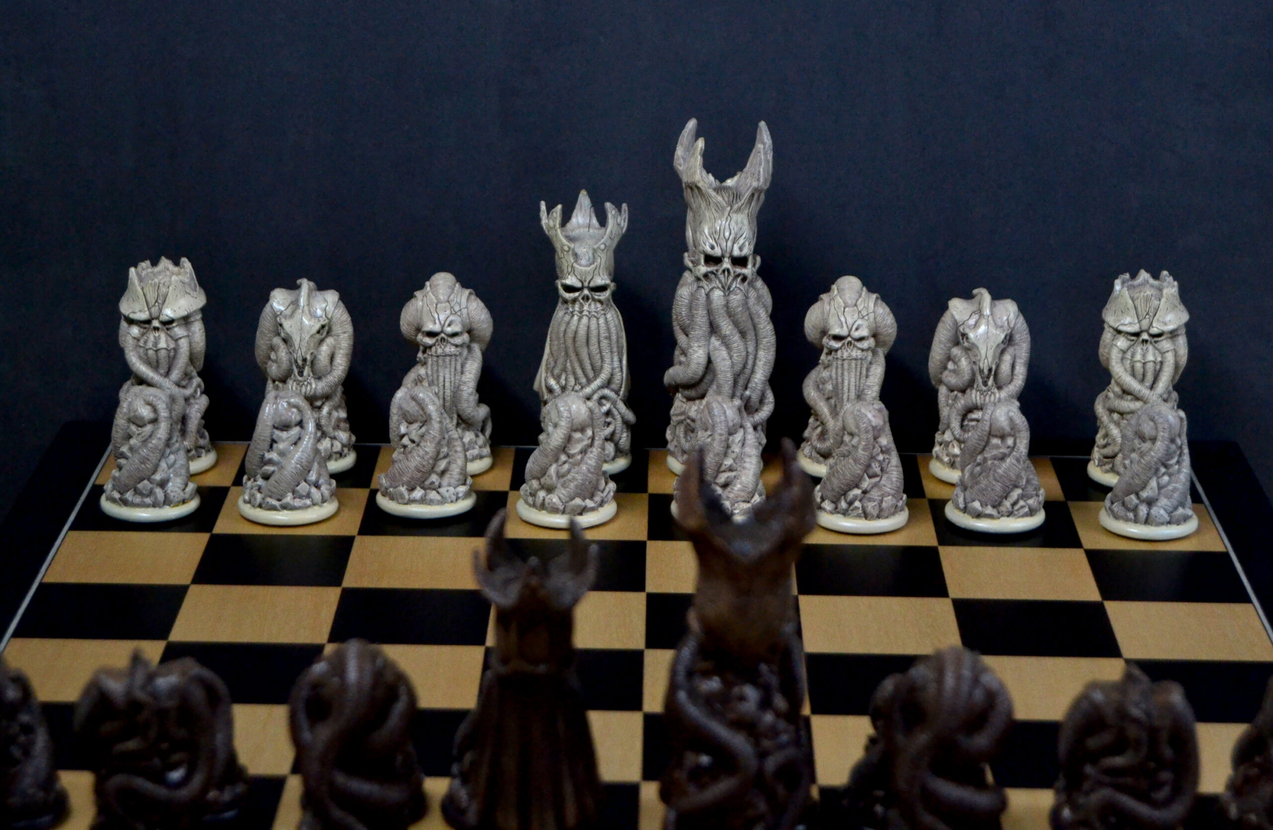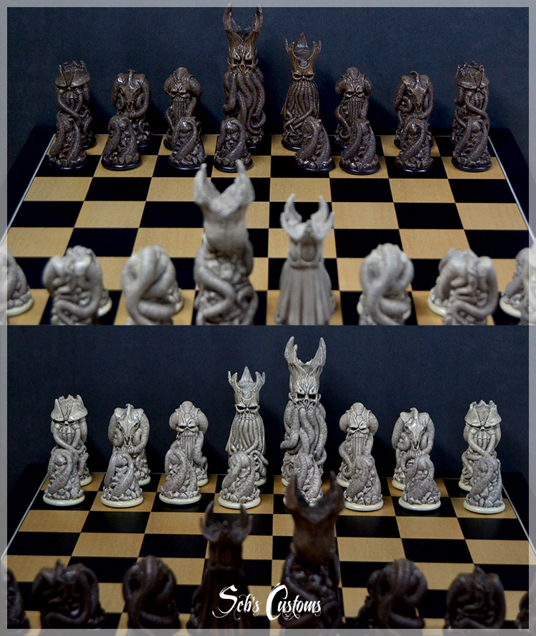 Plongez dans un univers unique avec ce jeu d’échecs entièrement sculpté et peint à la main, conçu à partir de croquis originaux et inspiré de multiples influences artistiques.