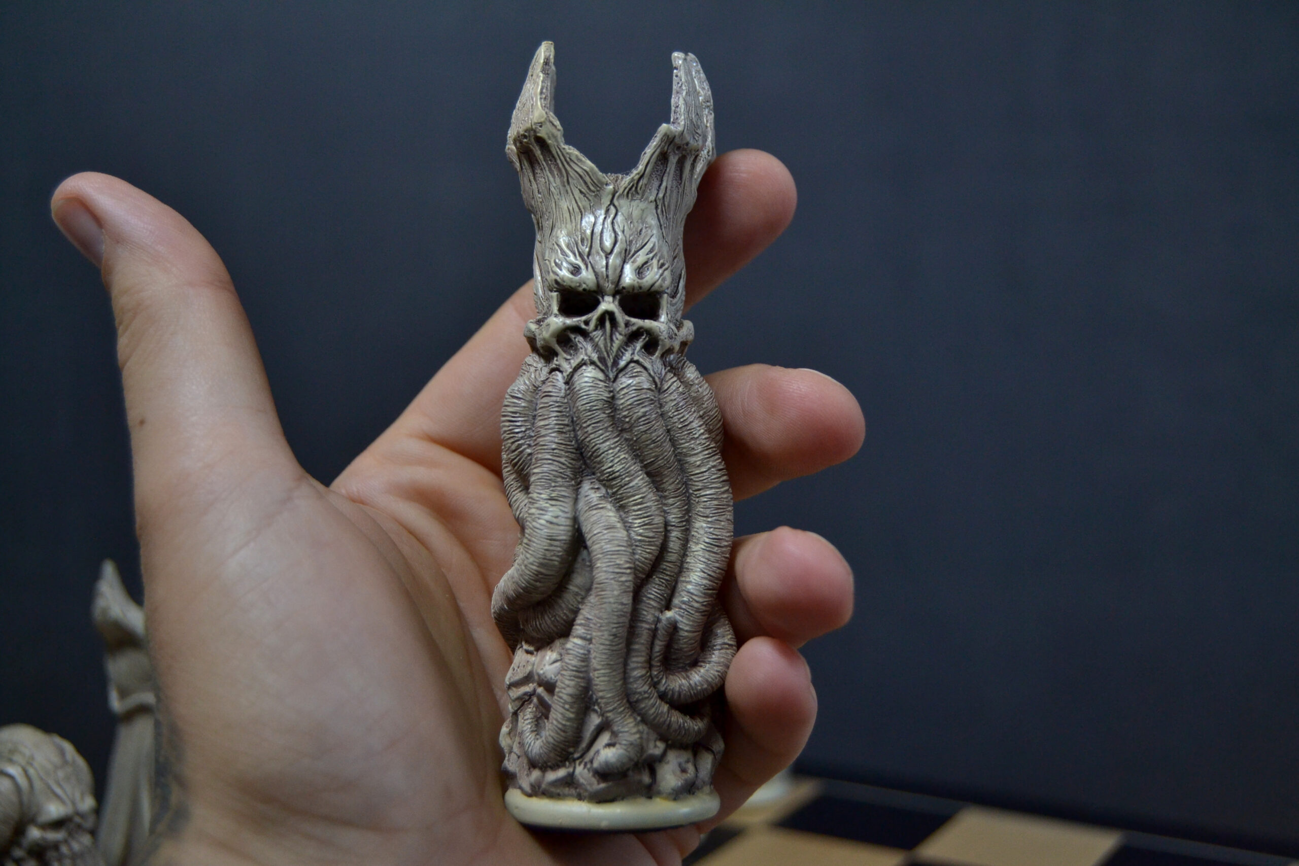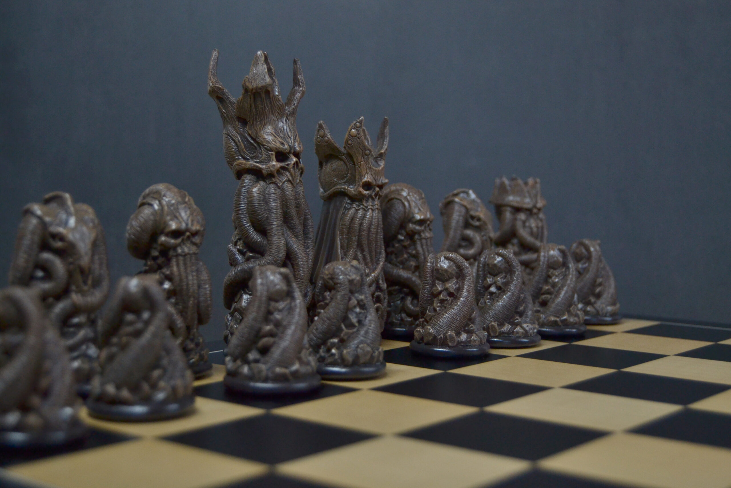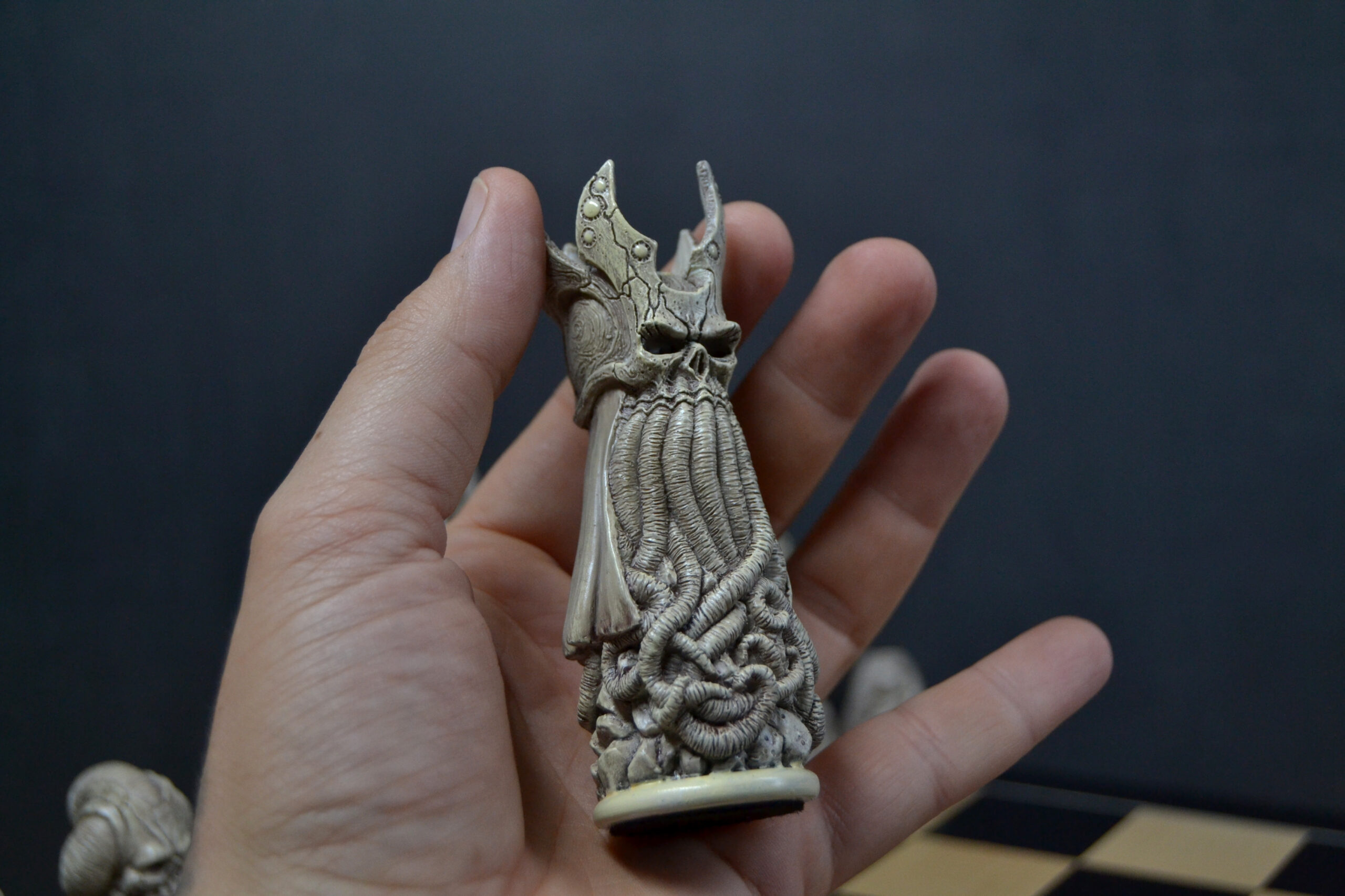 Plongez dans un univers unique avec ce jeu d’échecs entièrement sculpté et peint à la main, conçu à partir de croquis originaux et inspiré de multiples influences artistiques.